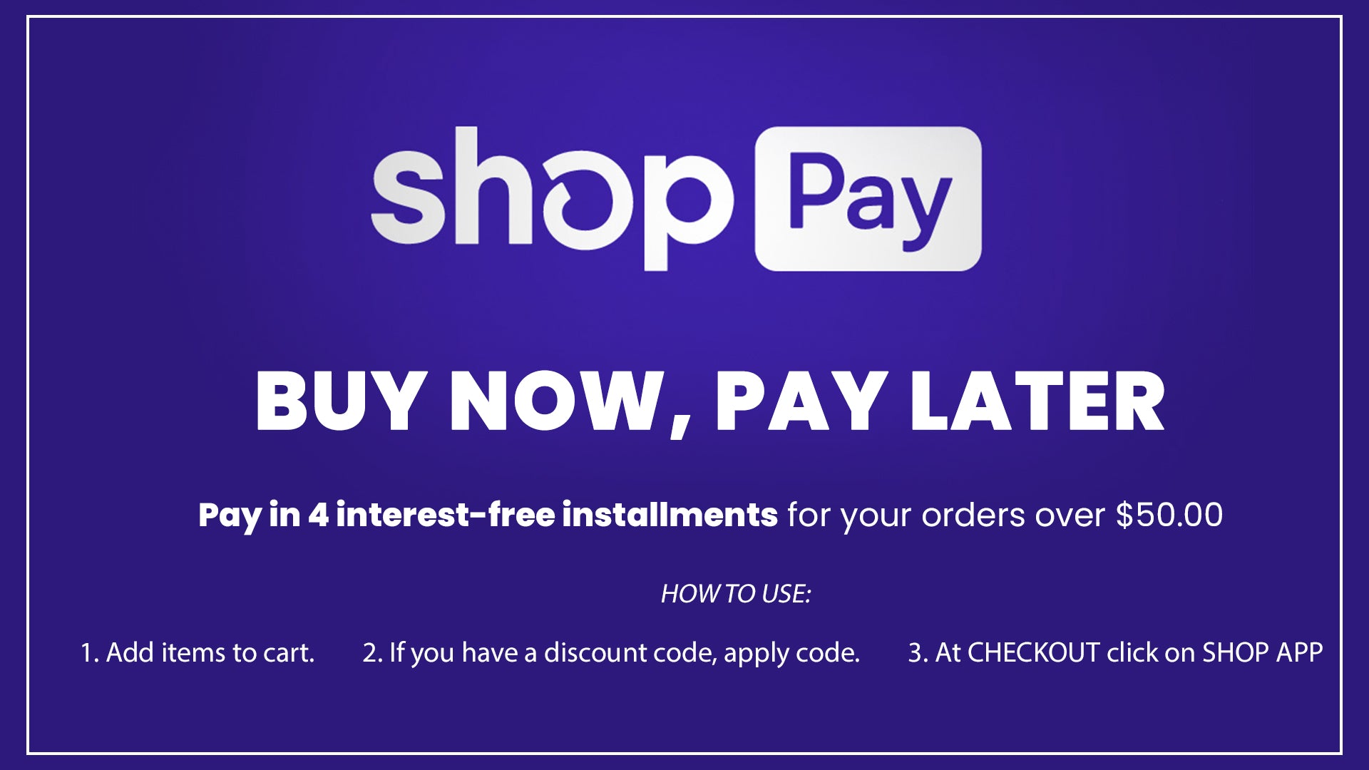 Use the amazing BUY NOW, PAY LATER option at checkou. Pay in 4 interest-free installments for your orders over $50.00.